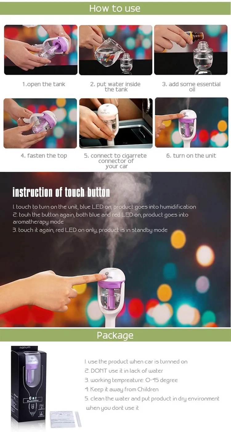 - Made of safe, health-friendly and fireproof ABS and PP materials, this aroma humidifier has got CE certifications to ensure you premium quality and good health. It will envelop your surroundings effectively and brings a SPA like feeling to your home and relax from a long day working.